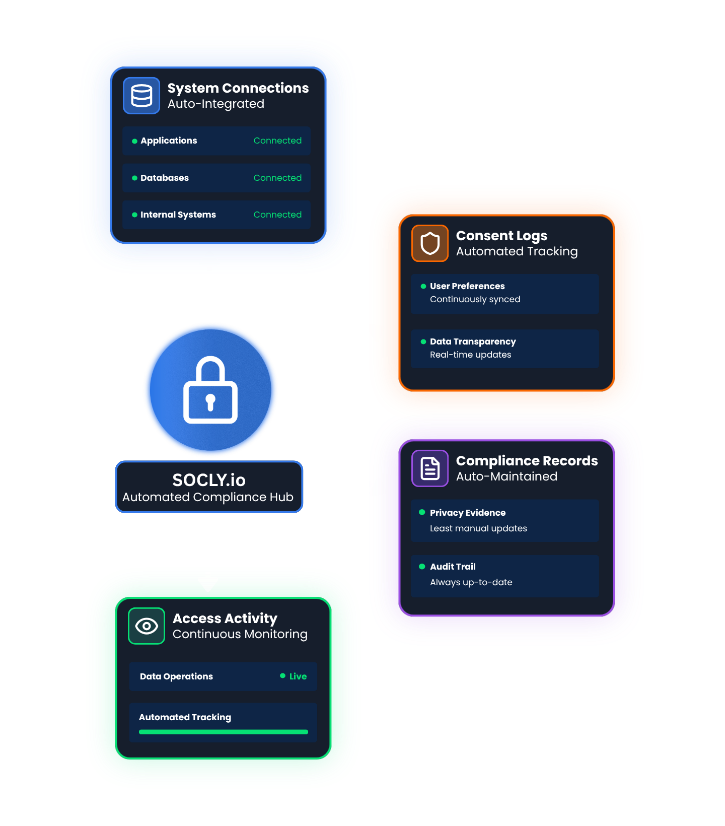 In order to maintain compliance records, SOCLY.io connects with your applications, databases, and internal systems.