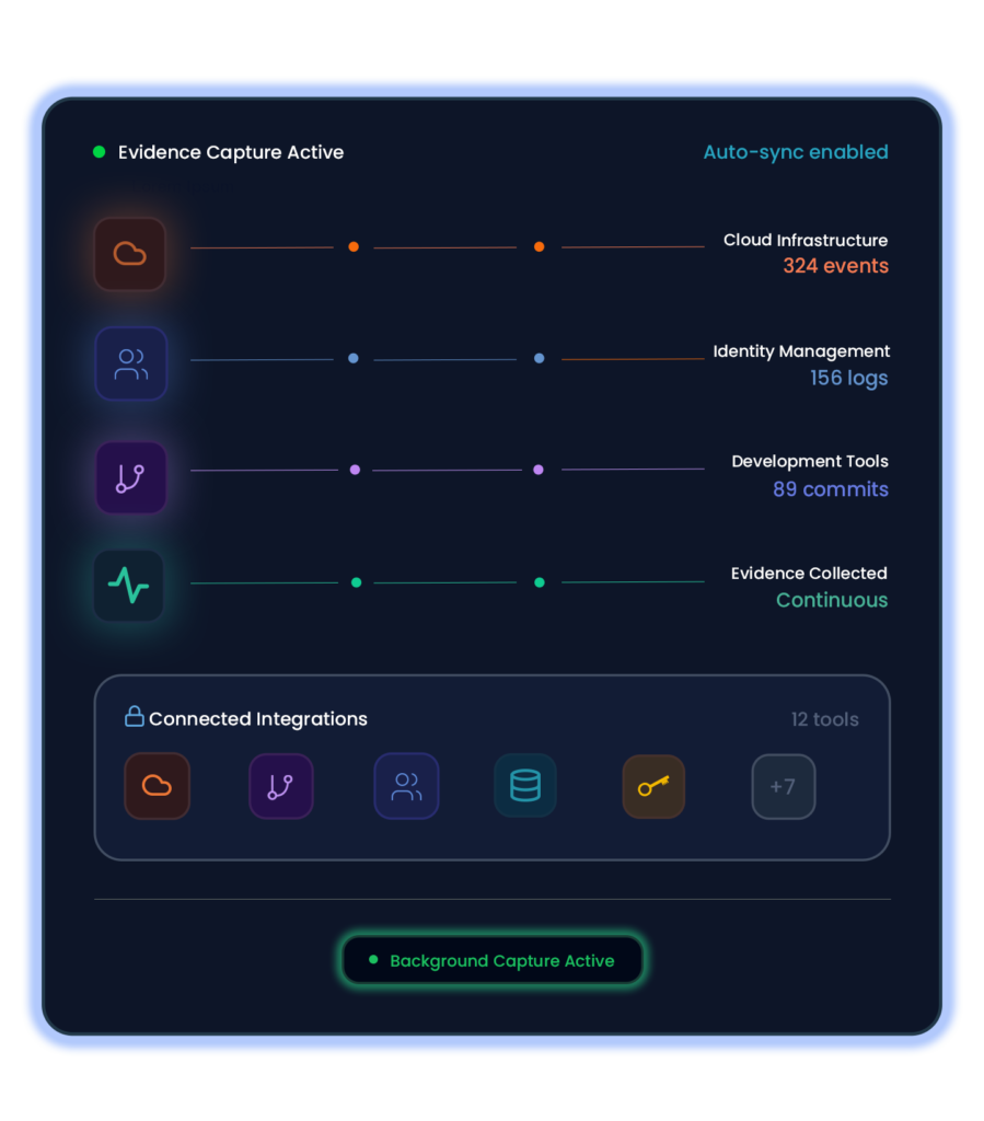 We integrate with your infrastructure, access management, and engineering tools to continually demonstrate control effectiveness for ISO 27001 audits. Without manual tracking or document management, everything stays up to date.