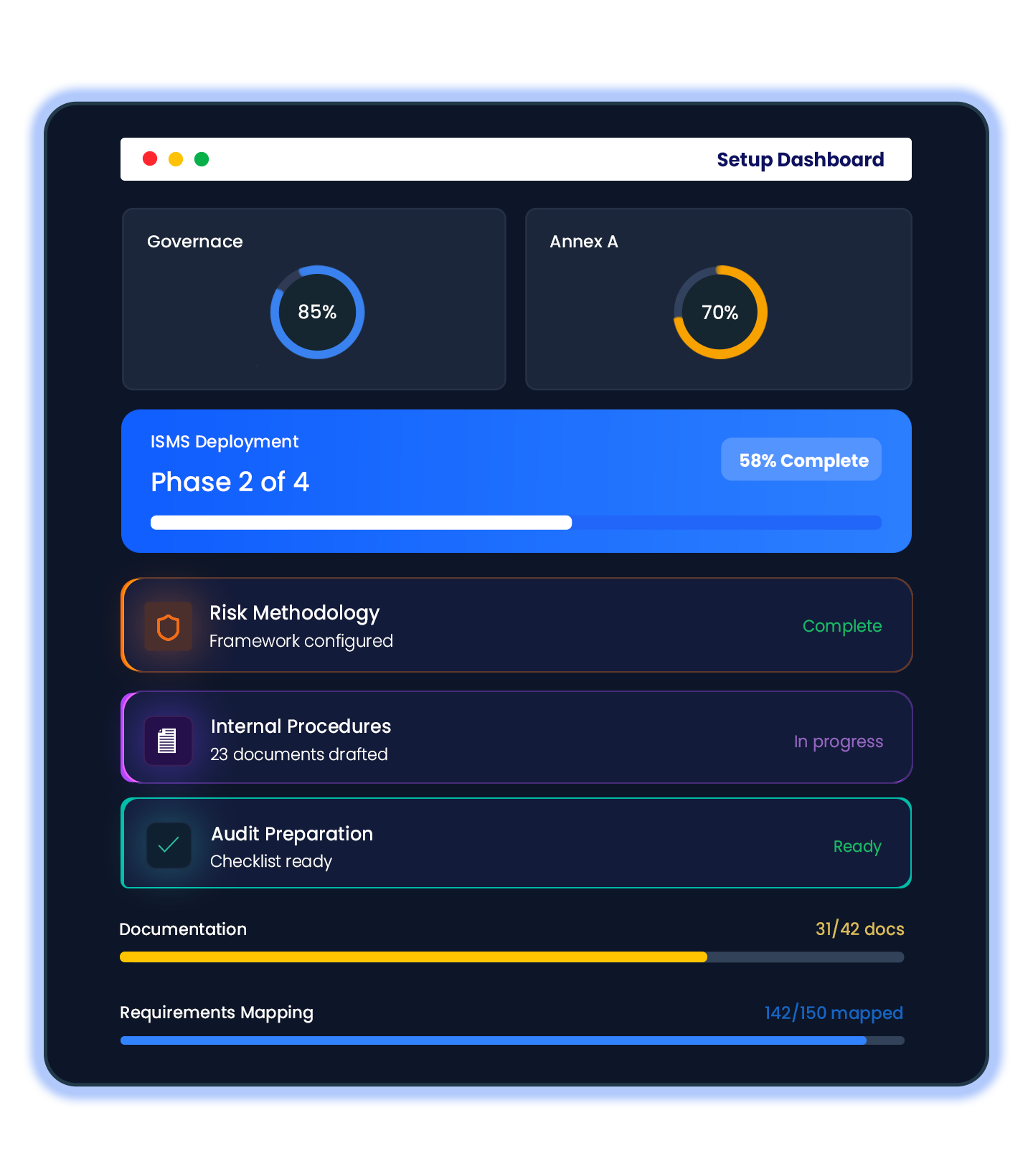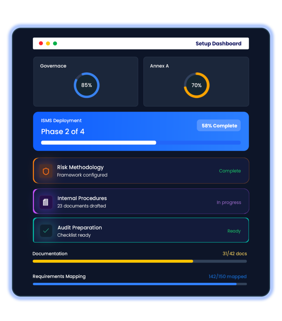 From scratch, we architect and deploy your ISO 27001 Information Security Management System. Business and technology requirements are mapped directly to governance, risk methodology, Annex A control implementation, internal procedures, documentation, and audit preparation.