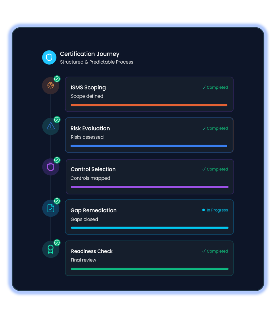 We provide a structured, automation-first approach to ISO 27001 certification, helping modern SaaS teams replace manual coordination, fragmented documentation, and consultant-heavy processes with a single operational system.