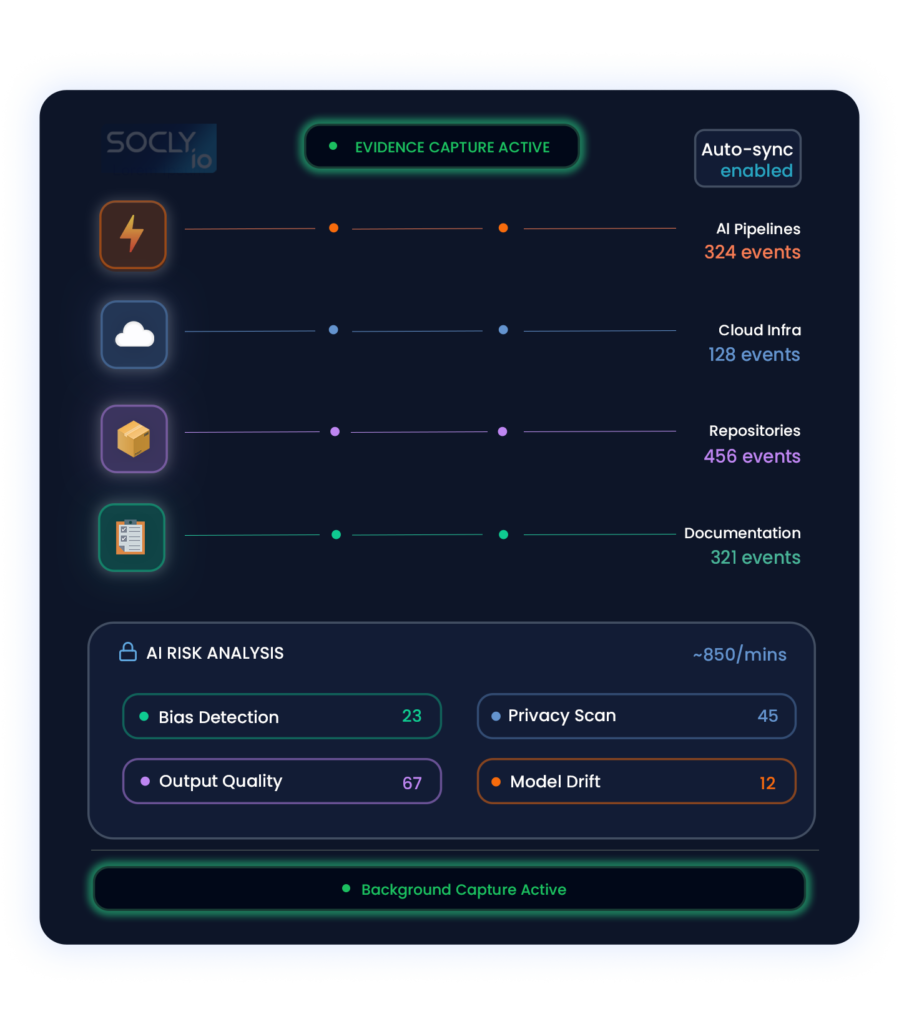 Without manual logs or last-minute audit preparation, AI risks are identified, tracked, and documented automatically in the background.