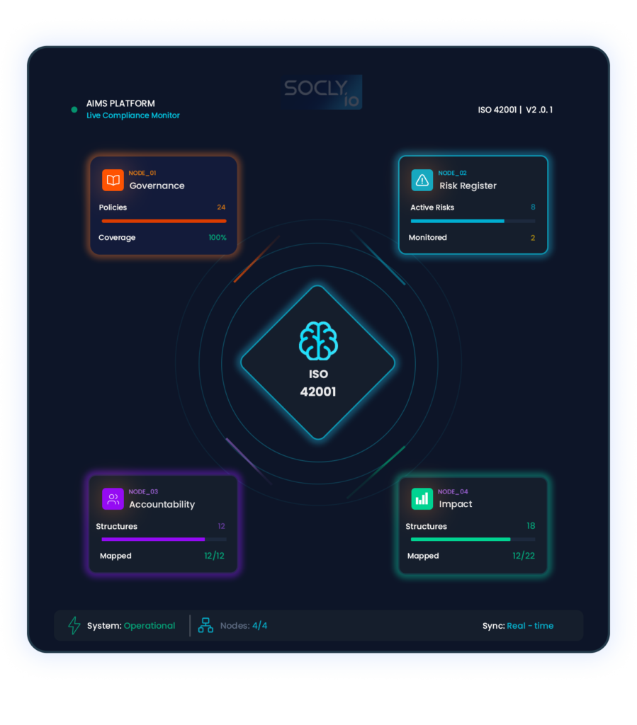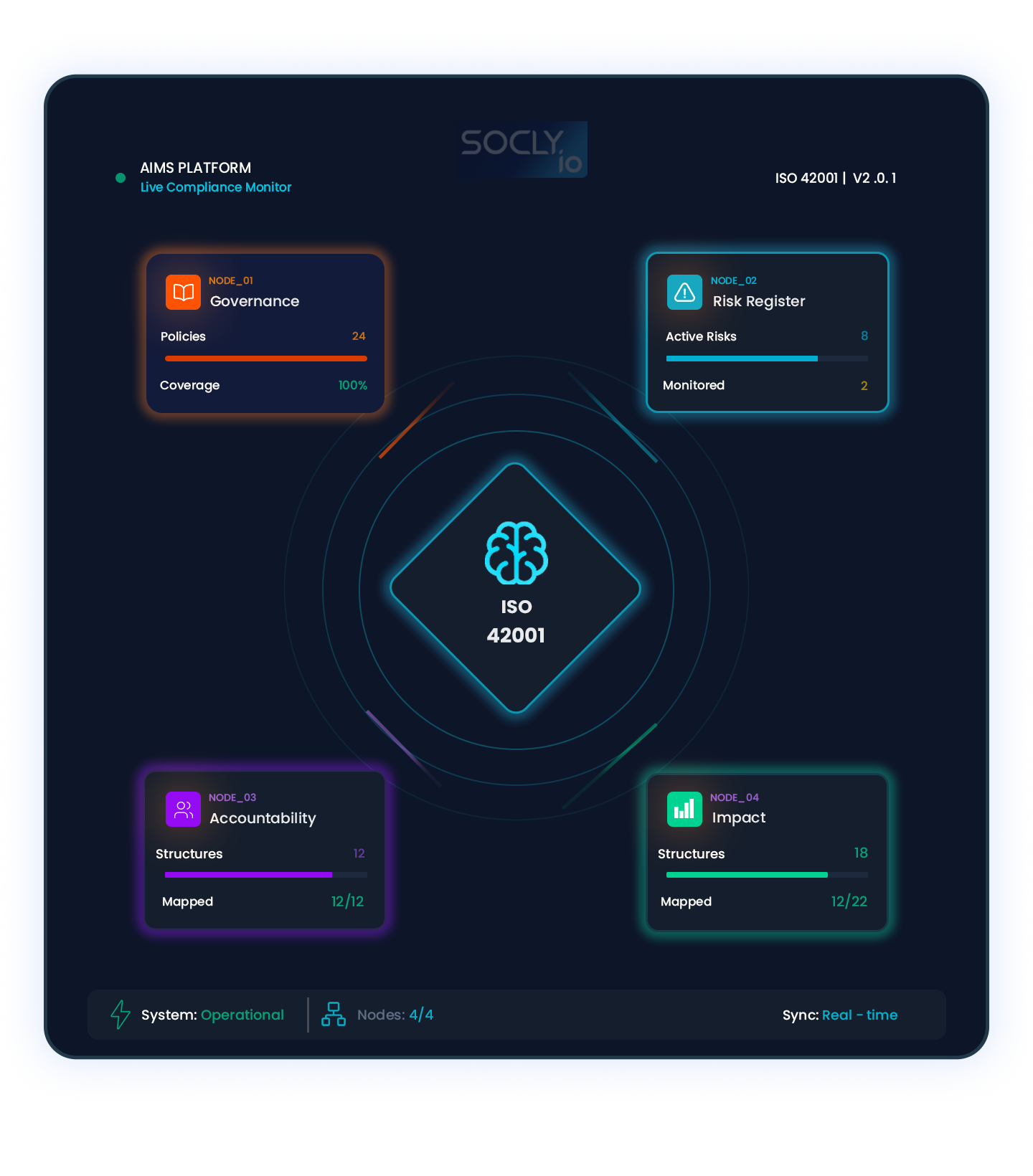 Our AIMS- AI Management System is aligned with ISO 42001 and covers governance policies, accountability structures, risk registers, impact assessments and required documentation for your real AI use cases.