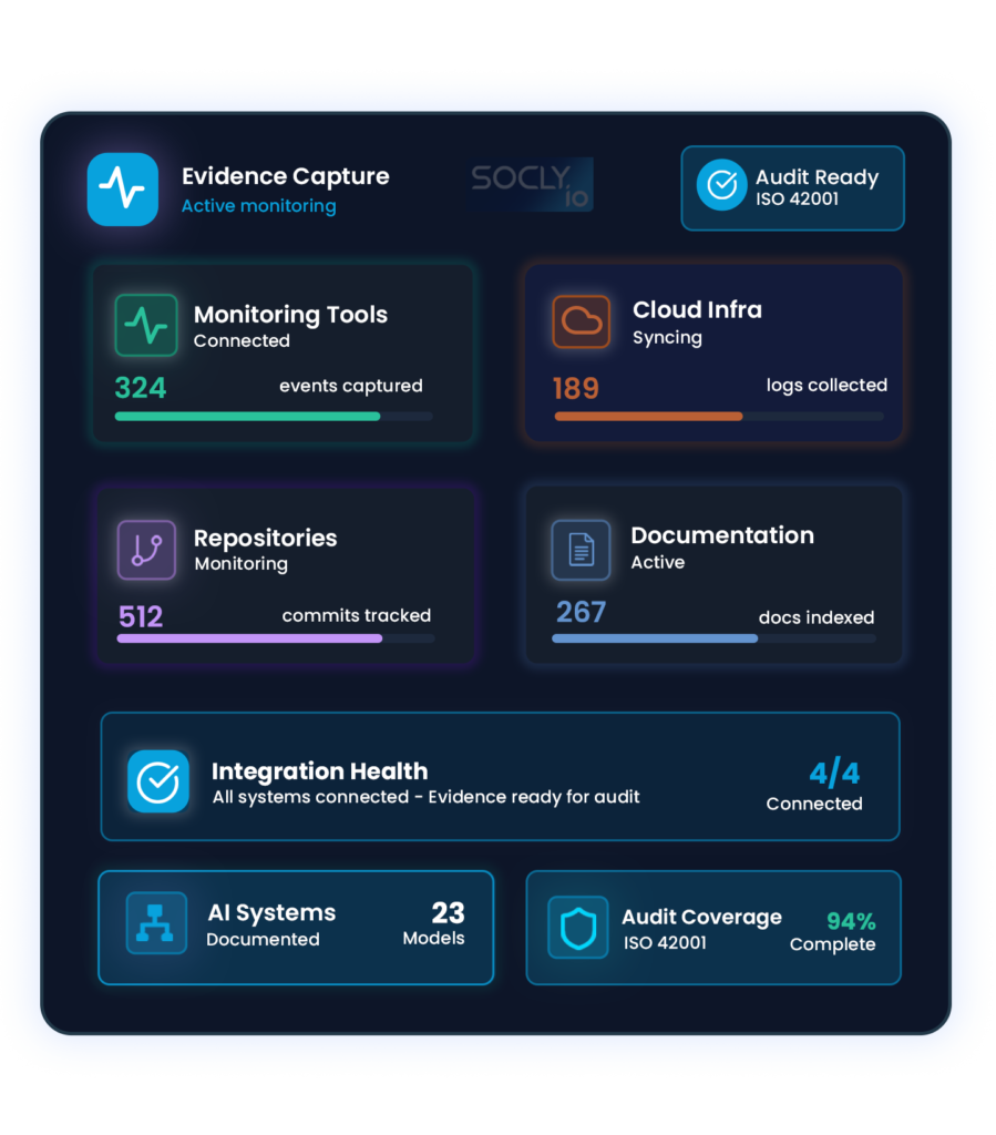 We integrate with your AI pipelines, cloud infrastructure, repositories, and internal documentation tools to maintain audit-ready evidence for ISO 42001.